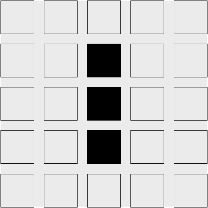 Мы можем вычислить следующее поколение, рассмотрев каждую клетку. Левая верхняя клетка мертва. Правило (4) - единственное правило перехода, которое применяется к мертвым клеткам. Однако, поскольку у левой верхней клетки нет ровно трех живых соседей, правило перехода не действует, и она остается мертвой в следующем поколении. То же самое происходит и со всеми остальными клетками в первом ряду.